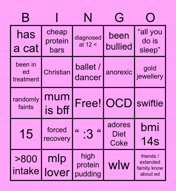 This bingo card has a free space and 24 words: forced recovery, mlp lover, ballet / dancer, >800 intake, “all you do is sleep”, has a cat, been in ed treatment, cheap protein bars, OCD, “ :3 “, anorexic, randomly faints, adores Diet Coke, bmi 14s, Christian, wlw, swiftie, diagnosed at 12 <, gold jewellery, mum is bff, friends / extended family know about ed, 15, been bullied and high protein pudding.