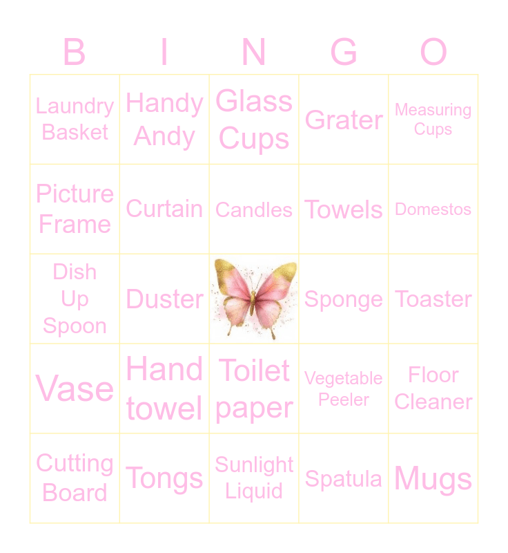 This bingo card has a free space and 45 words: Potato Masher, Mugs, Cutlery, Cutting Board, Whisk, Spatula, Glass Cups, Knife Set, Measuring Cups, Tongs, Grater, Sponge, Toilet paper, Hand towel, Dishcloth, Sunlight Liquid, Wooden Spoon, Dish Up Spoon, Bucket, Domestos, Handy Andy, All-Purpose Cleaner, Bleach, Laundry Basket, Dustpan and Broom, Toaster, Mixing Bowl, Bed Sheet, Vegetable Peeler, Vase, Black Bags, Floor Cleaner, Window Cleaner, Microfiber Cloths, Casserole Dish, Duster, Egg Boiler, Recipe Book, Gift Card, Candles, Picture Frame, Towels, Duvet Cover/Comforter, Curtain and Salt and Pepper Shaker.