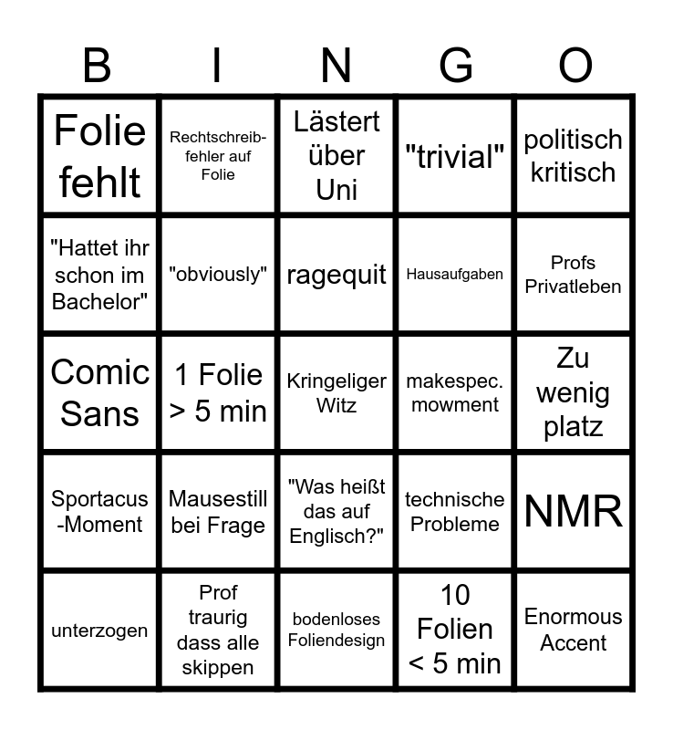 This bingo card has 50 words: jemand kommt zu spät, Kringeliger Witz, irgendwas auf Deutsch, bodenloses Foliendesign, Mausestill bei Frage, überzogen, Rechtschreib-fehler auf Folie, Prof verhaspelt sich enormst, "Hattet ihr schon im Bachelor", Folien falsche Reihenfolge, "obviously", "trivial", NMR, technische Probleme, unnötig lautes Geräusch aus Zuschauer-schaft, totes Tier, ragequit, makespec. mowment, jemand weint, politisch kritisch, 1 Folie > 5 min, 10 Folien < 5 min, Folie fehlt, Hausaufgaben, Meme, Enormous Accent, Profs Privatleben, NMR-bashing, Lästert über Uni, "Was heißt das auf Englisch?", "or in german: ...", Mobile Gamer, Studi beendet Profs sätze, Prof versteht Studi nicht, Prof traurig dass alle skippen, Nudes, Vom Prof geghosted, Arsch-Spaghetti, Frage falsch beantwortet, Zu wenig platz, Pop-Culture-Reference, "Any questions?", C. Elegans & Drosophila, AI, unterzogen, Comic Sans, Mikro geht aus, "basically", Sportacus -Moment and Heute morgen neues Paper gefunden.