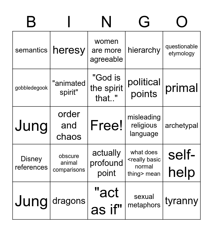 This bingo card has a free space and 24 words: obscure animal comparisons, dragons, "God is the spirit that..", Jung, questionable etymology, semantics, gobbledegook, heresy, misleading religious language, actually profound point, political points, Jung, what does <really basic normal thing> mean, self-help, "animated spirit", sexual metaphors, archetypal, women are more agreeable, primal, order and chaos, tyranny, Disney references, hierarchy and "act as if".