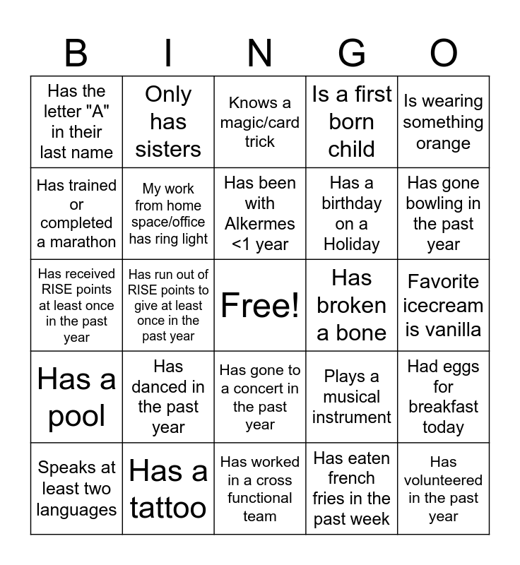 This bingo card has a free space and 52 words: Likes pizza, Has volunteered in the past year, Is wearing something pink, Has worked in a cross functional team, Has danced in the past year, Has gone to a movie or dinner with SO in the past year, Only has sisters, Owns a pet, Has trained or completed a marathon, Has gone on a cruise in the past year, My work from home space/office has ring light, Knows how to sew, Had eggs for breakfast today, Plays a musical instrument, Was born in November, Has attended a scientific conference in the last year, Has been with Alkermes <1 year, Has broken a bone, Listens to audio (pod casts, audio books etc), Is wearing something orange, Has run out of RISE points to give at least once in the past year, Has eaten french fries in the past week, Has the letter "A" in their last name, Has a birthday on a Holiday, Has participated in a TEI event or program in the last year, Has had a significant home improvement done in the past year, Has a collection of something, Wears size 9 shoes, Has gone bowling in the past year, Wears contacts, Has visited at least three continents, Is a first born child, Was named after a relative, Has been with Alkermes from 1 to <6 years, Was in the military, Knows a magic/card trick, Has a tattoo, Loves to read, Has visited at least 3 countries, Has met a celebrity, Has contributed to the launch a drug, Favorite icecream is vanilla, Has a pool, Has been with Alkermes >10 years, Has gone to a concert in the past year, Has a parent living with them, Has been with Alkermes ≥6 to 10 years, Has received RISE points at least once in the past year, Has seen a co-workers pet or child during a conference call, Goes to Dunkin Donuts or Starbucks at least 3X a week, Speaks at least two languages and Has made a major career change.