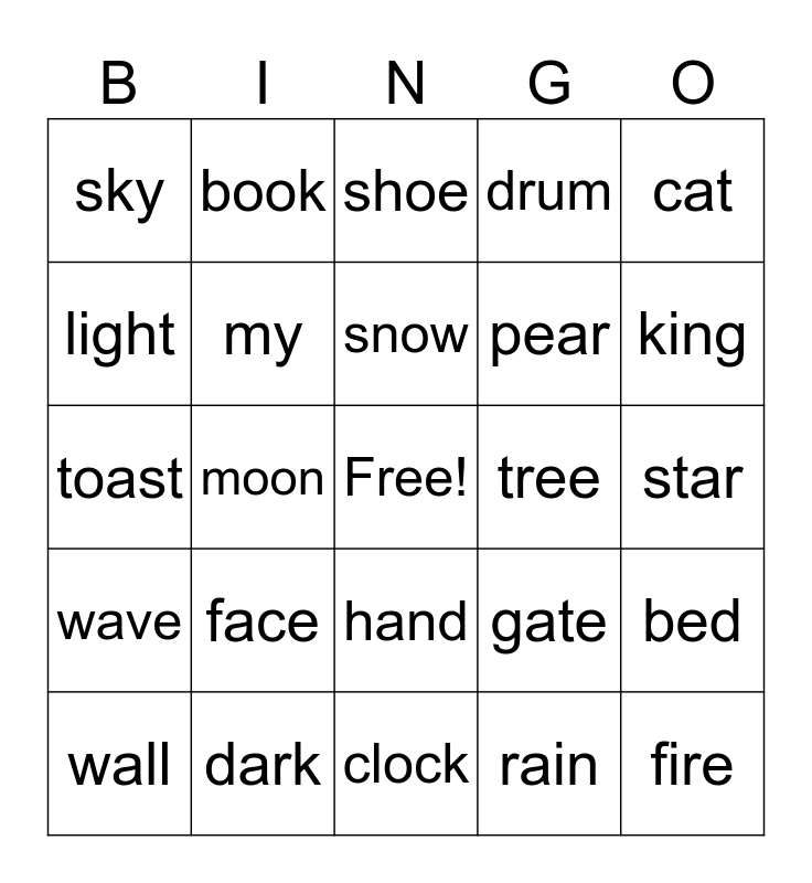 This bingo card has a free space and 24 words: face, dark, snow, wall, cat, sky, light, book, tree, hand, pear, toast, gate, bed, my, rain, star, shoe, king, moon, fire, wave, drum and clock.