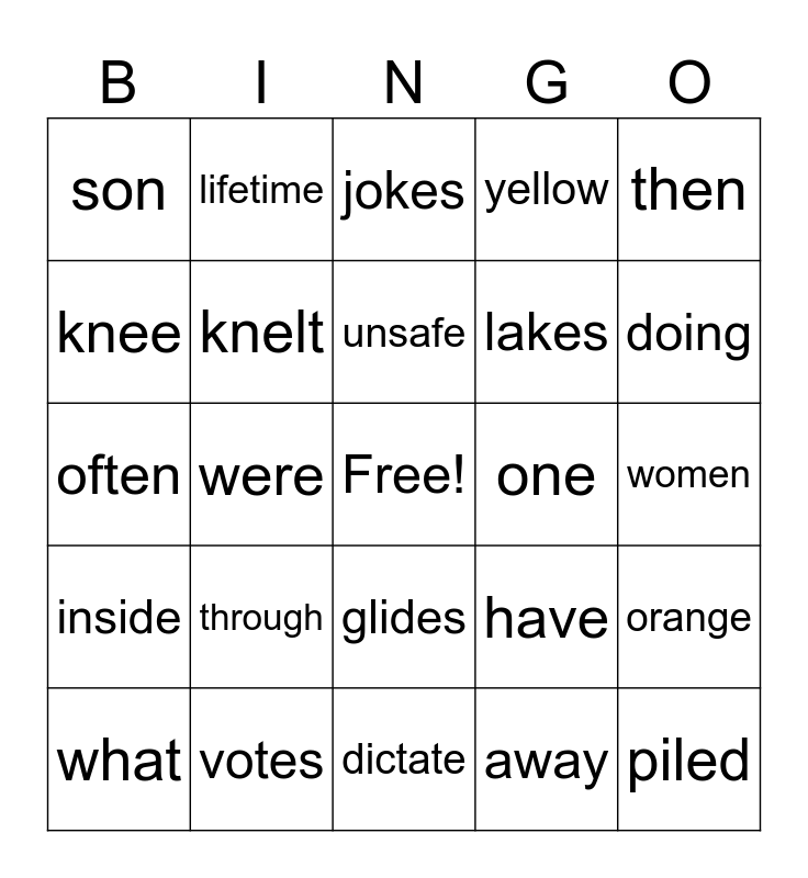 This bingo card has a free space and 29 words: what, their, were, phrase, son, jokes, knelt, through, one, votes, women, piled, dictate, away, doing, sideline, glides, inside, then, often, have, graph, lakes, knee, yellow, lifetime, orange, unsafe and voted.