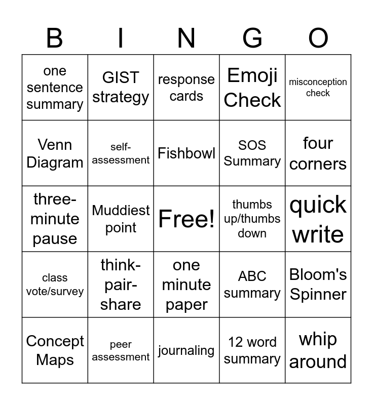 This bingo card has a free space and 29 words: Concept Maps, Exit Ticket, Muddiest point, 3-2-1 strategy, one sentence summary, response cards, self-assessment, think-pair-share, thumbs up/thumbs down, peer assessment, quick write, whip around, journaling, 12 word summary, four corners, stoplight, one minute paper, class vote/survey, misconception check, three-minute pause, ABC summary, Idea spinner, SOS Summary, Venn Diagram, Emoji Check, GIST strategy, Bloom's Spinner, Fishbowl and Socratic Seminar.
