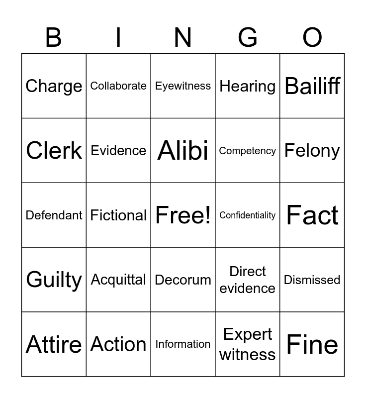 This bingo card has a free space and 24 words: Acquittal, Action, Alibi, Attire, Bailiff, Charge, Clerk, Collaborate, Confidentiality, Decorum, Competency, Defendant, Direct evidence, Dismissed, Evidence, Expert witness, Fact, Eyewitness, Felony, Fictional, Fine, Guilty, Hearing and Information.