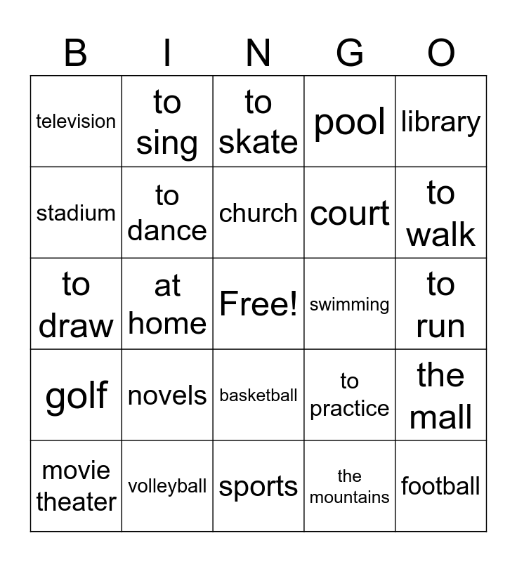 This bingo card has a free space and 34 words: soccer, the mountains, the park, to read, golf, to dance, library, movie theater, to sing, tennis, church, to skate, baseball, to watch, swimming, to walk, volleyball, to draw, novels, to practice, basketball, to swim, television, to run, sports, football, pool, beach, court, stadium, movies, at home, the mall and cafe.