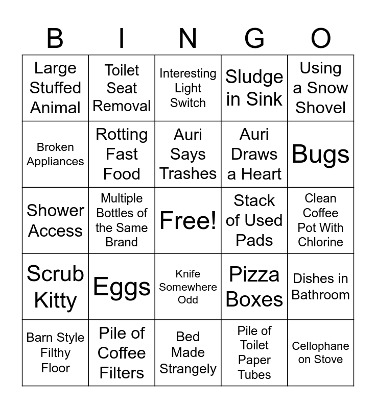 This bingo card has a free space and 24 words: Eggs, Pile of Coffee Filters, Auri Says Trashes, Barn Style Filthy Floor, Using a Snow Shovel, Large Stuffed Animal, Broken Appliances, Toilet Seat Removal, Stack of Used Pads, Knife Somewhere Odd, Auri Draws a Heart, Shower Access, Pizza Boxes, Dishes in Bathroom, Rotting Fast Food, Pile of Toilet Paper Tubes, Clean Coffee Pot With Chlorine, Interesting Light Switch, Bugs, Multiple Bottles of the Same Brand, Cellophane on Stove, Scrub Kitty, Sludge in Sink and Bed Made Strangely.