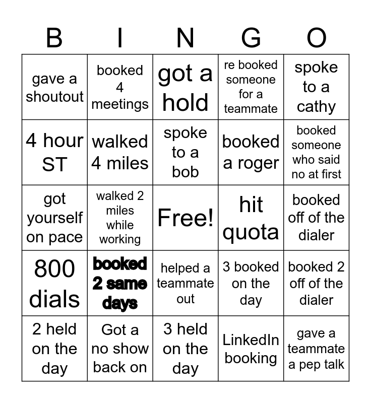 This bingo card has a free space and 24 words: booked 2 same days, Got a no show back on, spoke to a bob, 2 held on the day, spoke to a cathy, gave a shoutout, 4 hour ST, booked 4 meetings, hit quota, helped a teammate out, booked a roger, got yourself on pace, 3 booked on the day, booked 2 off of the dialer, walked 4 miles, LinkedIn booking, booked off of the dialer, got a hold, booked someone who said no at first, walked 2 miles while working, gave a teammate a pep talk, 800 dials, re booked someone for a teammate and 3 held on the day.