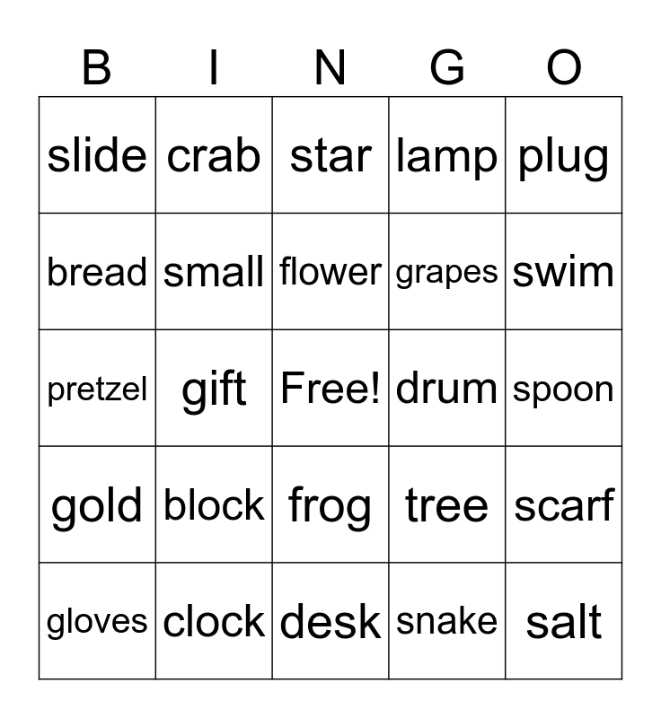 This bingo card has a free space and 24 words: block, clock, flower, gloves, plug, slide, bread, crab, drum, frog, grapes, pretzel, tree, scarf, small, snake, spoon, star, swim, gift, salt, gold, lamp and desk.