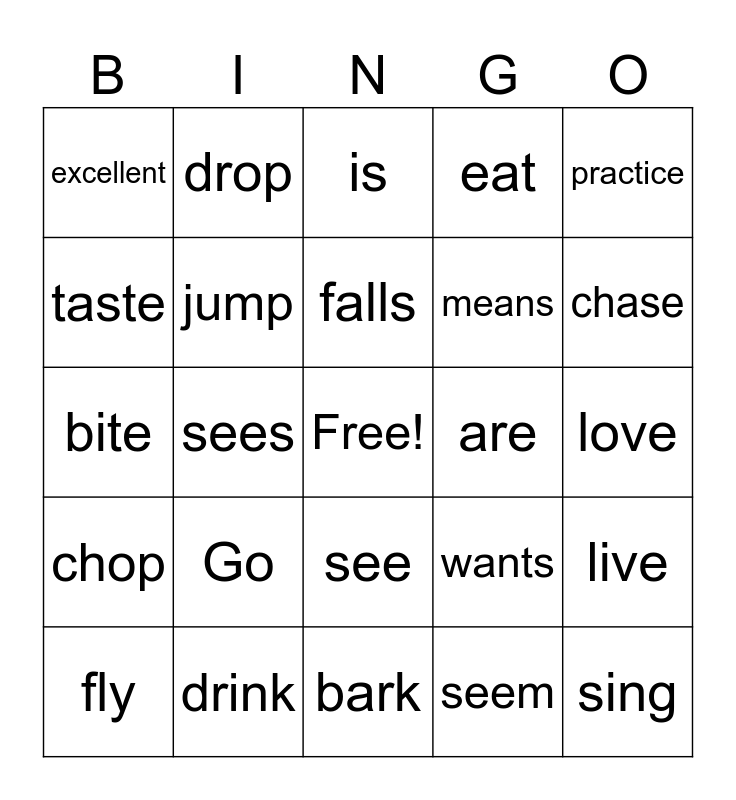 This bingo card has a free space and 24 words: Go, drink, falls, fly, practice, excellent, taste, drop, are, see, means, bite, wants, live, jump, seem, love, is, chase, sees, sing, chop, eat and bark.