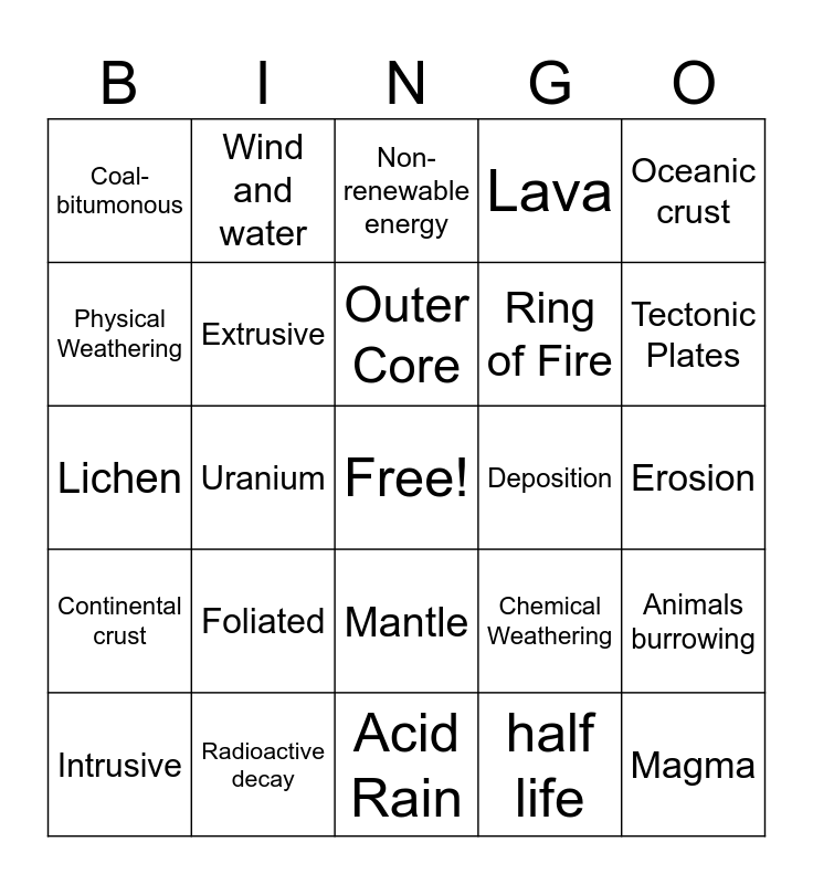 This bingo card has a free space and 39 words: Igneous, Metamorphic, Sedimentary, Extrusive, Intrusive, Mantle, Outer Core, Inner Core, Oceanic crust, Continental crust, Uranium, Lava, Magma, Erosion, Deposition, Foliated, Non-foliated, Coal-bitumonous, Subduction, Chemical Weathering, Physical Weathering, Acid Rain, Ring of Fire, Tectonic Plates, Loam, Clay, Pressure and heat, Convection currents, Rip rap, Wind and water, Acid rain, Renewable Energy, Non-renewable energy, Radioactive decay, half life, Frost wedge, Animals burrowing, Lichen and Bacteria.