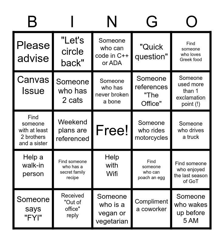 This bingo card has a free space and 72 words: "Put a pin in that", "Let's circle back", Weekend plans are referenced, "It is what it is/it be that way", Reference time change, "Is it 5:00 yet?", "Quick question", "Real quick...", Someone references "The Office", You receive a GIF in Webex, Someone says "FYI", "Sorry, I was on mute", Someone used more than 1 exclamation point (!), Please advise, Write a helpdesk/ITSS haiku on the back of this, Find someone with at least 2 brothers and a sister, Find someone who can poach an egg, Find someone who loves Greek food, Show someone a sick dance move (not Kelsie's), Someone who drives a truck, Find someone who has a secret family recipe, Someone who wakes up before 5 AM, Find someone who enjoyed the last season of GoT, Find someone who has traveled outside the US, Approve your timesheets for the week, 0 unread emails, Talk with department outside ITS, Learn an interesting fact and share in group chat, Turn around a bad or uncomfy situation, Help a coworker, Received "Out of office" reply, Help someone with Respondus, Took full lunch break, Helped a regular, Compliment a coworker, Had to use AM to help someone, Answer at least 15 phone calls in 1 day, Respond on-call, Canvas Issue, Arrived on Time, Help with Wifi, Wrong department walkin/call/ticket, Meet with your supervisor (1-1), Took both breaks, Leave the office for lunch, Help a walk-in person, Help with Duo, Stay hydrated, Someone who is a Workaholic, Someone who has at least 3 kids, Someone who answers emails at all/any time of day, Someone who loves sushi, Introduce yourself to someone from AOS, Someone who rides motorcycles, Someone who plays a musical instrument, Someone who is married, Someone who can code in C++ or ADA, Someone who has never broken a bone, Someone who has an Android phone, Introduce yourself to someone in A/V or Hardware, Someone who hasn't watched Harry Potter, Say 'Hi' to IT Director that is NOT Heather, Someone who doesn't use social media, Someone who is a vegan or vegetarian, Someone who plays D&D, Someone who is an only child, Someone who has 2 cats, Someone who speaks at least 2 languages, Introduce yourself to our CIO, Someone born in the same month as you, Someone who loves the TV show Lost and Someone who only uses Microsoft Edge.