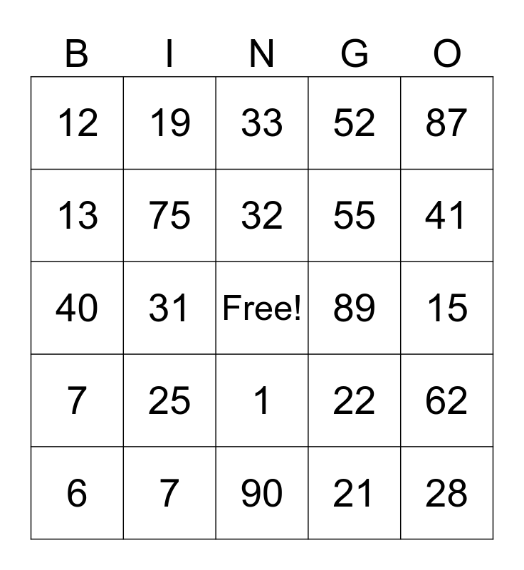 This bingo card has a free space and 24 words: 25, 7, 32, 6, 87, 12, 13, 19, 89, 1, 55, 40, 22, 62, 75, 21, 15, 33, 41, 31, 28, 7, 52 and 90.