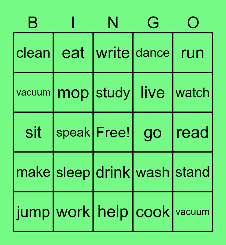 This bingo card has a free space and 24 words: sleep, work, study, jump, run, clean, vacuum, eat, go, drink, live, sit, wash, stand, mop, cook, read, write, watch, speak, vacuum, make, dance and help.