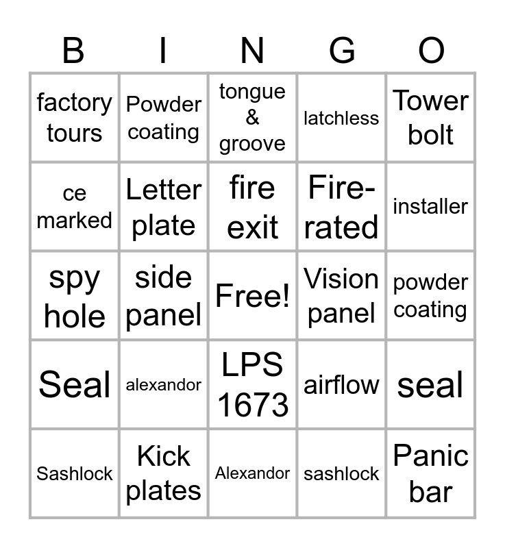 This bingo card has a free space and 88 words: vision panel, pull handle, LPS 1673, louvre panel, Smoke-rated, fire-rated, acoustic-rated, marine grade, push bar, d handle, closer, jamb, seal, powder coating, UKCA, fire exit, personnel, single door, double door, LPS 1175, dutch fold, kick plates, spy hole, letter plate, sashlock, panic bar, lever handle, access control, PAS 24, tower bolt, tongue & groove, latchless, theodor, fitting kit, alexandor, ce marked, factory tours, expandable sides, steel, installer, side panel, over panel, glazed, airflow, Vision panel, Pull handle, LPS 1673, Louvre panel, Smoke-rated, Fire-rated, Acoustic-rated, Marine grade, Push bar, D handle, Closer, Jamb, Seal, Powder coating, UKCA, Fire exit, Personnel, Single door, Double door, LPS 1175, Dutch fold, Kick plates, Spy hole, Letter plate, Sashlock, Panic bar, Lever handle, Access control, PAS 24, Tower bolt, Tongue & groove, Latchless, Theodor, Fitting kit, Alexandor, CE marked, Factory tours, Expandable sides, Steel, Installer, Side panel, Over panel, Glazed and Airflow.