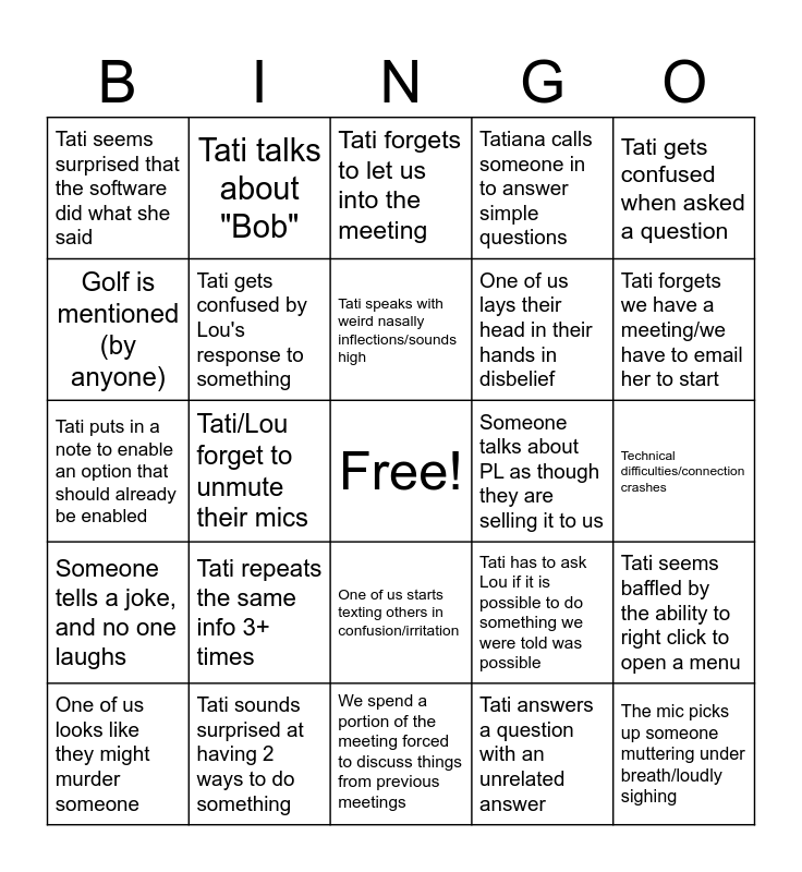This bingo card has a free space and 24 words: Tati repeats the same info 3+ times, Tati sounds surprised at having 2 ways to do something, Tati speaks with weird nasally inflections/sounds high, One of us looks like they might murder someone, Tati gets confused when asked a question, Tati seems surprised that the software did what she said, Golf is mentioned (by anyone), Tati talks about "Bob", Someone talks about PL as though they are selling it to us, One of us starts texting others in confusion/irritation, One of us lays their head in their hands in disbelief, Tati puts in a note to enable an option that should already be enabled, Tati has to ask Lou if it is possible to do something we were told was possible, Tati seems baffled by the ability to right click to open a menu, Tati gets confused by Lou's response to something, Tati answers a question with an unrelated answer, Technical difficulties/connection crashes, Tati forgets to let us into the meeting, Tati forgets we have a meeting/we have to email her to start, Tati/Lou forget to unmute their mics, The mic picks up someone muttering under breath/loudly sighing, Someone tells a joke, and no one laughs, Tatiana calls someone in to answer simple questions and We spend a portion of the meeting forced to discuss things from previous meetings.
