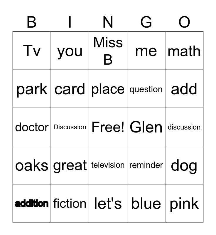 This bingo card has a free space and 29 words: addition, little, Discussion, word, Tv, Miss B, card, great, Glen, fiction, discussion, pink, let's, blue, add, new, television, oaks, math, doctor, reminder, orange, question, park, me, you, dog, place and orange.