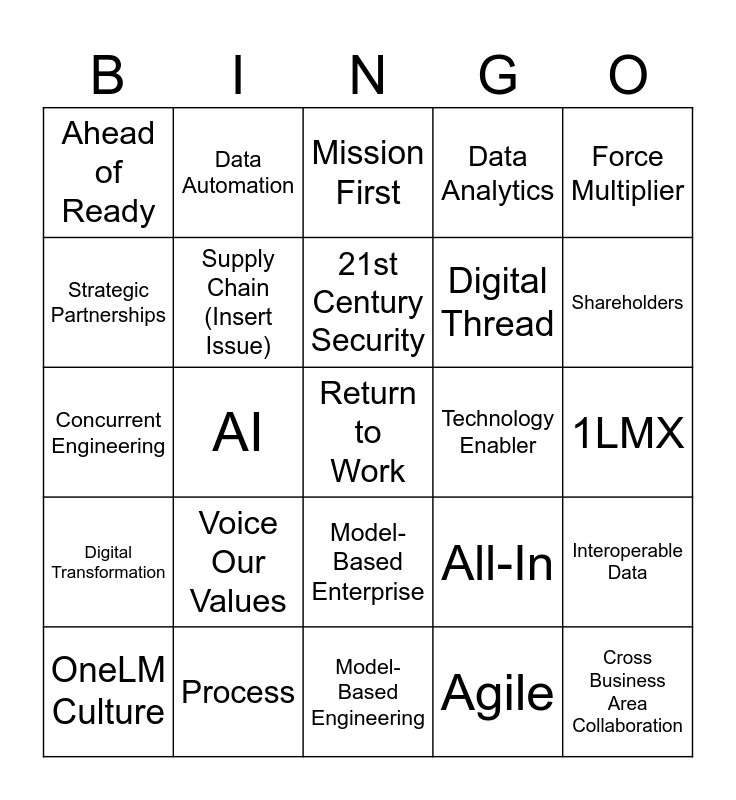 This bingo card has 25 words: Voice Our Values, Model-Based Engineering, 21st Century Security, OneLM Culture, Force Multiplier, Ahead of Ready, Strategic Partnerships, Data Automation, Technology Enabler, Model-Based Enterprise, Digital Thread, Concurrent Engineering, All-In, Interoperable Data, Supply Chain (Insert Issue), Cross Business Area Collaboration, 1LMX, Mission First, Shareholders, AI, Return to Work, Process, Digital Transformation, Data Analytics and Agile.