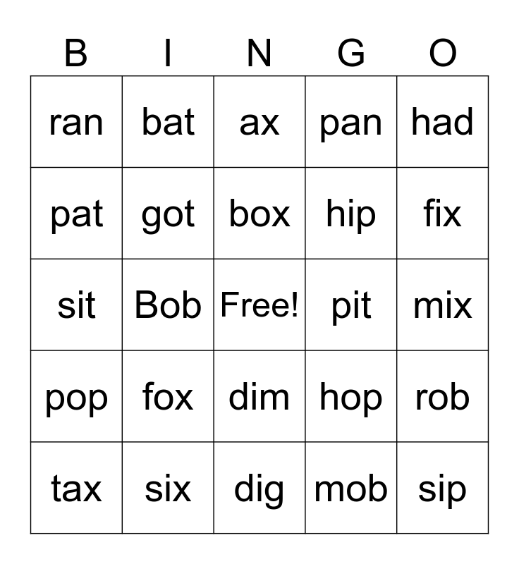 This bingo card has a free space and 24 words: fox, six, box, tax, had, ran, pat, bat, pit, dim, hip, sit, hop, rob, got, mob, mix, ax, fix, Bob, sip, pop, pan and dig.
