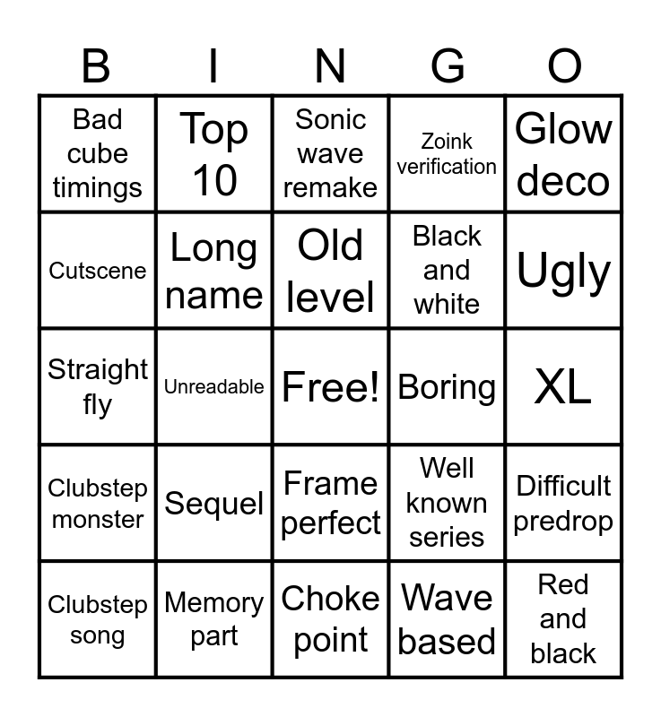 This bingo card has a free space and 24 words: Sequel, Memory part, Old level, Clubstep song, Glow deco, Bad cube timings, Cutscene, Top 10, Boring, Frame perfect, Black and white, Straight fly, Well known series, Difficult predrop, Long name, Wave based, XL, Sonic wave remake, Ugly, Unreadable, Red and black, Clubstep monster, Zoink verification and Choke point.