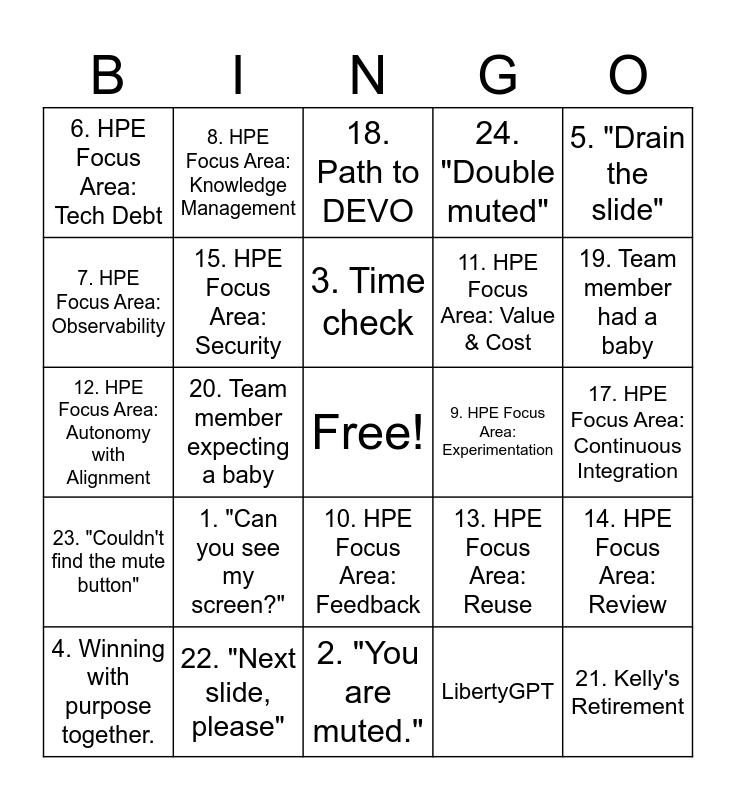 This bingo card has a free space and 25 words: 1. "Can you see my screen?", 2. "You are muted.", 3. Time check, 4. Winning with purpose together., 5. "Drain the slide", 6. HPE Focus Area: Tech Debt, 7. HPE Focus Area: Observability, 8. HPE Focus Area: Knowledge Management, 9. HPE Focus Area: Experimentation, 10. HPE Focus Area: Feedback, 11. HPE Focus Area: Value & Cost, 12. HPE Focus Area: Autonomy with Alignment, 13. HPE Focus Area: Reuse, 14. HPE Focus Area: Review, 15. HPE Focus Area: Security, 16. HPE Focus Area: Testing, 17. HPE Focus Area: Continuous Integration, 18. Path to DEVO, 19. Team member had a baby, 20. Team member expecting a baby, 21. Kelly's Retirement, 22. "Next slide, please", 23. "Couldn't find the mute button", 24. "Double muted" and LibertyGPT.