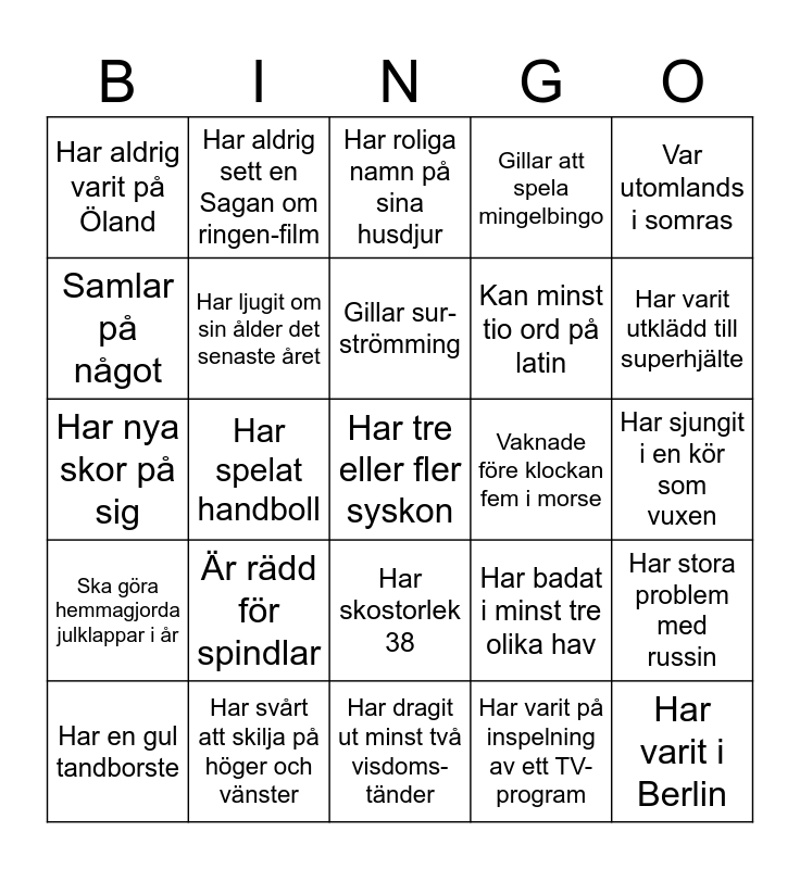 This bingo card has 25 words: Är rädd för spindlar, Har dragit ut minst två visdoms-tänder, Gillar sur-strömming, Har en gul tandborste, Var utomlands i somras, Har aldrig varit på Öland, Samlar på något, Har aldrig sett en Sagan om ringen-film, Vaknade före klockan fem i morse, Har skostorlek 38, Kan minst tio ord på latin, Har nya skor på sig, Har badat i minst tre olika hav, Har stora problem med russin, Har ljugit om sin ålder det senaste året, Har varit i Berlin, Har sjungit i en kör som vuxen, Har roliga namn på sina husdjur, Har varit utklädd till superhjälte, Har spelat handboll, Har tre eller fler syskon, Har svårt att skilja på höger och vänster, Ska göra hemmagjorda julklappar i år, Gillar att spela mingelbingo and Har varit på inspelning av ett TV-program.