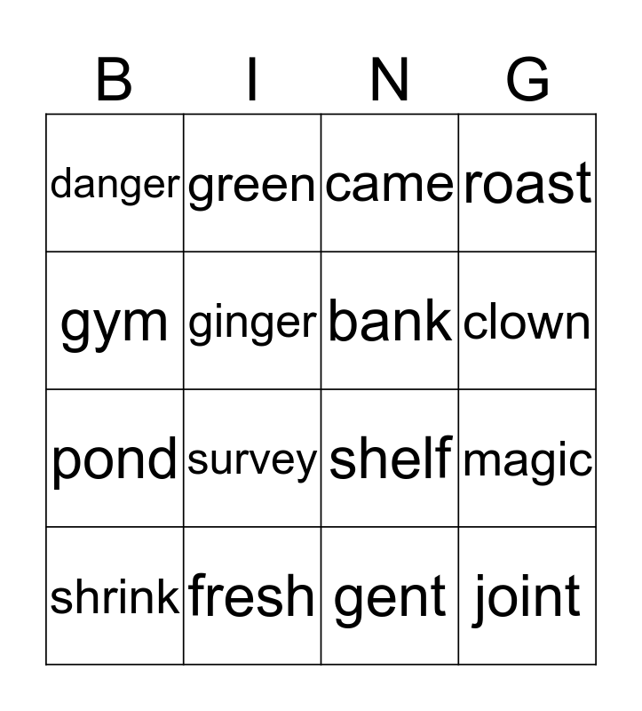 This bingo card has 63 words: champ, boost, bench, paint, beast, punch, green, smell, clown, spark, crunch, spring, gent, gym, gentle, ginger, magic, danger, band, pond, chest, joint, roast, burnt, spoon, sport, string, scrunch, thrill, trench, they, grey, obey, prey, survey, melt, thank, toast, soft, bank, shelf, fresh, spoil, groan, shrink, street, blast, time, your, make, put, old, house, very, by, came, about, I'm, made, no, go, and and I.