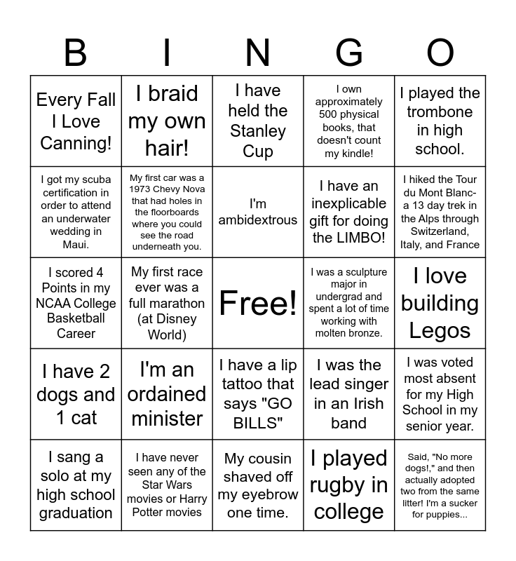This bingo card has a free space and 24 words: I'm an ordained minister, I have never seen any of the Star Wars movies or Harry Potter movies, I'm ambidextrous, I sang a solo at my high school graduation, I played the trombone in high school., Every Fall I Love Canning!, I got my scuba certification in order to attend an underwater wedding in Maui., I braid my own hair!, I was a sculpture major in undergrad and spent a lot of time working with molten bronze., I have a lip tattoo that says "GO BILLS", I have an inexplicable gift for doing the LIMBO!, I scored 4 Points in my NCAA College Basketball Career, I was the lead singer in an Irish band, I was voted most absent for my High School in my senior year., My first car was a 1973 Chevy Nova that had holes in the floorboards where you could see the road underneath you., I played rugby in college, I love building Legos, I have held the Stanley Cup, I hiked the Tour du Mont Blanc- a 13 day trek in the Alps through Switzerland, Italy, and France, My first race ever was a full marathon (at Disney World), Said, "No more dogs!," and then actually adopted two from the same litter! I'm a sucker for puppies..., I have 2 dogs and 1 cat, I own approximately 500 physical books, that doesn't count my kindle! and My cousin shaved off my eyebrow one time..
