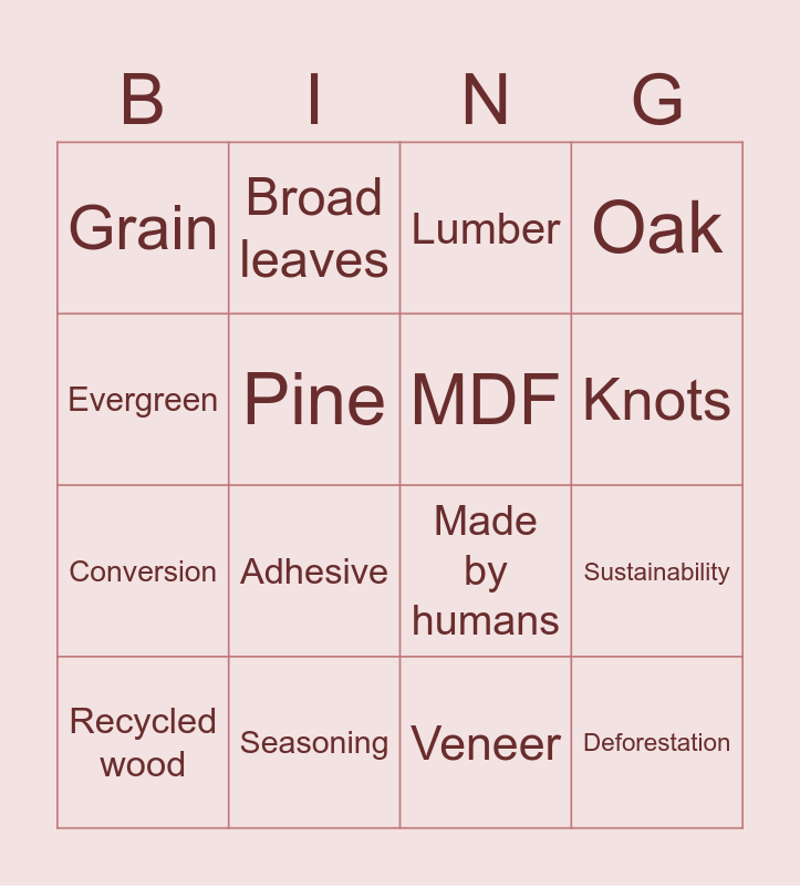 This bingo card has 22 words: Seasoning, Lumber, Broad leaves, Bark, Pine, MDF, Grain, Lumber, Made by humans, Deforestation, Conversion, Oak, Growth rings, Coniferous, Veneer, Deciduous, Sustainability, Recycled wood, Adhesive, Evergreen, Knots and Leaves fall.