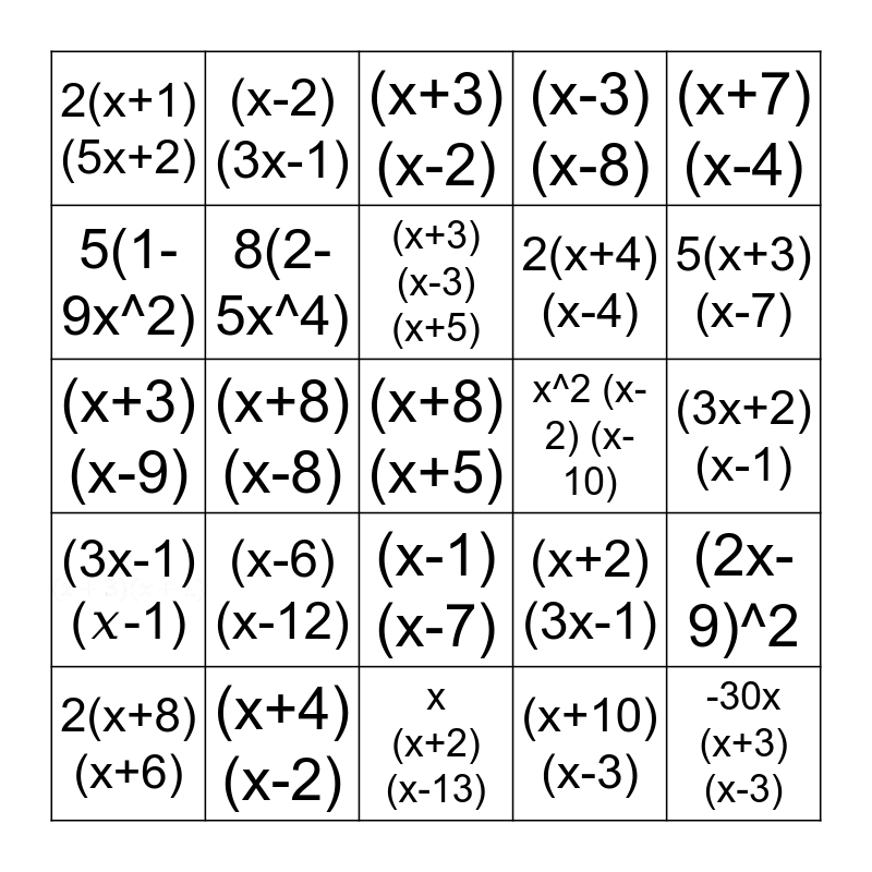 This bingo card has 1 images and 45 words: (x+3)(x+1), (x+8)(x+5), (x+5)(x+4), 2(x+8)(x+6), (x+6)(x+1), (x+10)(x-3), (x+3)(x-2), 3(x+15)(x-3), (x+7)(x-4), (x+4)(x-2), (x-3)(x-8), x^2 (x-2) (x-10), (x-1)(x-7), (x-6)(x-12), (x-5)(x-7), x (x+2) (x-13), (x+1)(x-9), (x+3)(x-9), (x+5)(x-8), 5(x+3)(x-7), (x-2)(3x-1), (x+1)(5x-4), (3x+1)(x-2), 2(x+1)(5x+2), (5x-9)(x-1), (3x+2)(x-1), (3x-4)(x-1), 3x (x+1)(2x-9), (x+2)(3x-1), (3x-1)(𝑥-1), (3x+2)^2, (2x-9)^2, (5x+6)^2, (4x-7)^2, (7x+10)^2, (x+8)(x-8), (5x+3)(5x-3), 14x^2 (x+2) (x-2), -30x (x+3) (x-3), (x+3) (x-3) (x+5), 5(1-9x^2), 2(x+4) (x-4), -3(6+7x^2), 8(2-5x^4) and 2x^3 (7+9x).