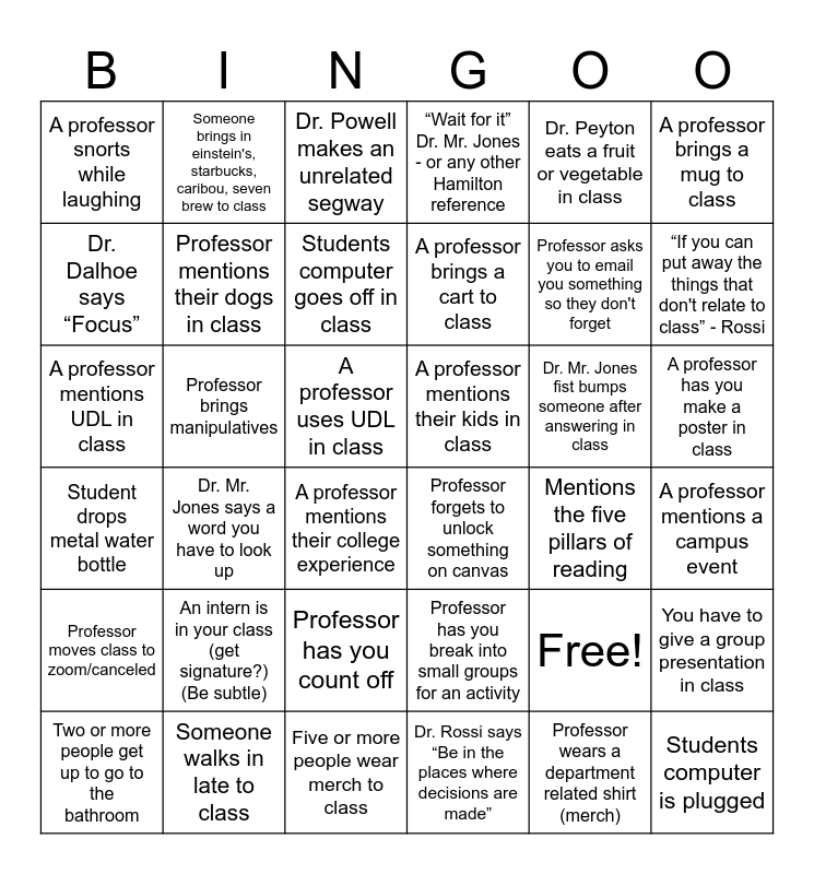 This bingo card has 37 words: Free!, Professor has you break into small groups for an activity, Professor wears a department related shirt (merch), Dr. Dalhoe says “Focus”, Dr. Mr. Jones says a word you have to look up, Dr. Mr. Jones fist bumps someone after answering in class, Professor mentions their dogs in class, Dr. Rossi says “Be in the places where decisions are made”, Dr. Peyton eats a fruit or vegetable in class, Two or more people get up to go to the bathroom, “If you can put away the things that don't relate to class” - Rossi, “Wait for it” Dr. Mr. Jones - or any other Hamilton reference, A professor mentions UDL in class, A professor uses UDL in class, A professor brings a mug to class, A professor mentions their kids in class, An intern is in your class (get signature?) (Be subtle), Dr. Powell makes an unrelated segway, A professor has you make a poster in class, Professor brings manipulatives, A professor snorts while laughing, A professor brings a cart to class, A professor mentions their college experience, Mentions the five pillars of reading, Someone walks in late to class, A professor mentions a campus event, Someone brings in einstein's, starbucks, caribou, seven brew to class, Five or more people wear merch to class, You have to give a group presentation in class, Professor has you count off, Someone is dressed up for placement, Professor forgets to unlock something on canvas, Professor asks you to email you something so they don't forget, Professor moves class to zoom/canceled, Student drops metal water bottle, Students computer goes off in class and Students computer is plugged.