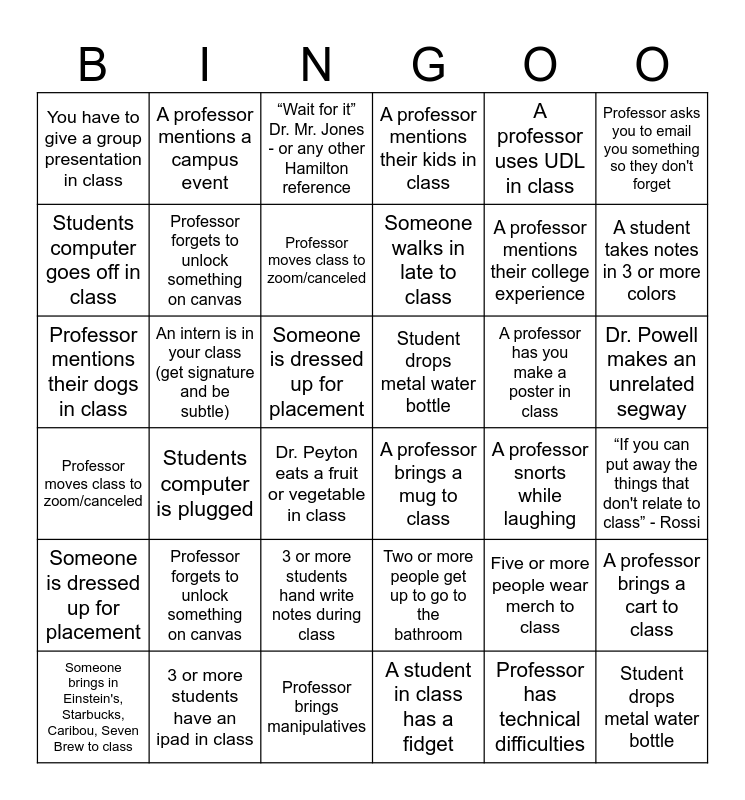 This bingo card has 44 words: Free!, Professor mentions their dogs in class, Dr. Rossi says “Be in the places where decisions are made”, Dr. Peyton eats a fruit or vegetable in class, Two or more people get up to go to the bathroom, “If you can put away the things that don't relate to class” - Rossi, “Wait for it” Dr. Mr. Jones - or any other Hamilton reference, A professor mentions UDL in class, A professor uses UDL in class, A professor brings a mug to class, A professor mentions their kids in class, An intern is in your class (get signature and be subtle), Dr. Powell makes an unrelated segway, A professor has you make a poster in class, Professor brings manipulatives, A professor snorts while laughing, A professor brings a cart to class, A professor mentions their college experience, Mentions the five pillars of reading, Someone walks in late to class, A professor mentions a campus event, Someone brings in Einstein's, Starbucks, Caribou, Seven Brew to class, Five or more people wear merch to class, You have to give a group presentation in class, Professor has you count off, Someone is dressed up for placement, Professor forgets to unlock something on canvas, Professor asks you to email you something so they don't forget, Professor moves class to zoom/canceled, Student drops metal water bottle, Students computer goes off in class, Students computer is plugged, 3 or more students have an ipad in class, A student in class has a fidget, A student takes notes in 3 or more colors, 3 or more students hand write notes during class, Professor has technical difficulties, Someone is dressed up for placement, Professor forgets to unlock something on canvas, Professor asks you to email you something so they don't forget, Professor moves class to zoom/canceled, Student drops metal water bottle, Students computer goes off in class and Students computer is plugged in.