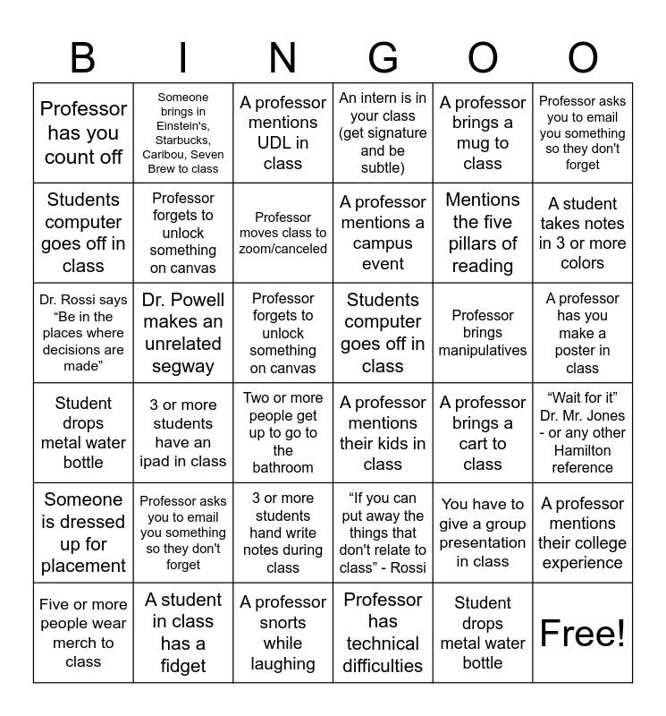 This bingo card has 43 words: Free!, Dr. Rossi says “Be in the places where decisions are made”, Dr. Peyton eats a fruit or vegetable in class, Two or more people get up to go to the bathroom, “If you can put away the things that don't relate to class” - Rossi, “Wait for it” Dr. Mr. Jones - or any other Hamilton reference, A professor mentions UDL in class, A professor uses UDL in class, A professor brings a mug to class, A professor mentions their kids in class, An intern is in your class (get signature and be subtle), Dr. Powell makes an unrelated segway, A professor has you make a poster in class, Professor brings manipulatives, A professor snorts while laughing, A professor brings a cart to class, A professor mentions their college experience, Mentions the five pillars of reading, Someone walks in late to class, A professor mentions a campus event, Someone brings in Einstein's, Starbucks, Caribou, Seven Brew to class, Five or more people wear merch to class, You have to give a group presentation in class, Professor has you count off, Someone is dressed up for placement, Professor forgets to unlock something on canvas, Professor asks you to email you something so they don't forget, Professor moves class to zoom/canceled, Student drops metal water bottle, Students computer goes off in class, Students computer is plugged, 3 or more students have an ipad in class, A student in class has a fidget, A student takes notes in 3 or more colors, 3 or more students hand write notes during class, Professor has technical difficulties, Someone is dressed up for placement, Professor forgets to unlock something on canvas, Professor asks you to email you something so they don't forget, Professor moves class to zoom/canceled, Student drops metal water bottle, Students computer goes off in class and Students computer is plugged in.