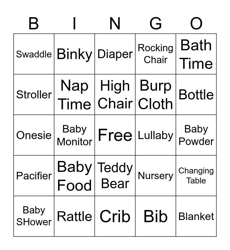 This bingo card has a free space and 24 words: Baby Food, Rattle, High Chair, Baby SHower, Bath Time, Swaddle, Stroller, Binky, Lullaby, Teddy Bear, Burp Cloth, Onesie, Nursery, Changing Table, Nap Time, Bib, Baby Powder, Diaper, Bottle, Baby Monitor, Blanket, Pacifier, Rocking Chair and Crib.