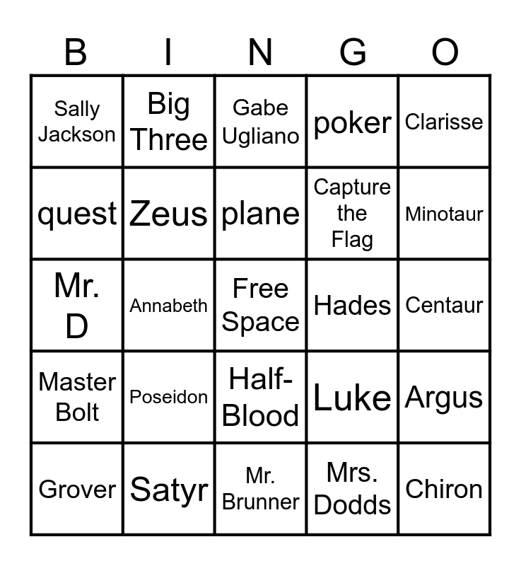 This bingo card has a free space and 29 words: Grover, Yancy Academy, Annabeth, Percy, Sally Jackson, Gabe Ugliano, Zeus, Poseidon, Hades, Satyr, Centaur, Chiron, Mr. Brunner, Mrs. Dodds, Minotaur, blue, Half-Blood, Master Bolt, Clarisse, Mr. D, Luke, Hermes, Capture the Flag, quest, poker, Big Three, Argus, plane and Medusa.
