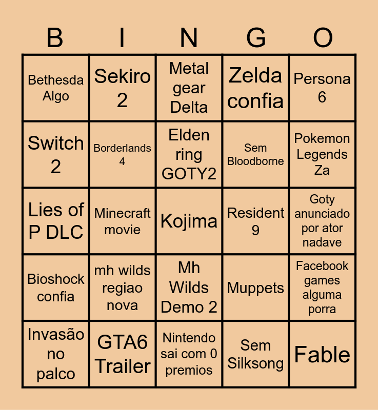 This bingo card has a free space and 24 words: mh wilds regiao nova, GTA6 Trailer, Elden ring GOTY2, Invasão no palco, Persona 6, Bethesda Algo, Switch 2, Sekiro 2, Resident 9, Mh Wilds Demo 2, Sem Bloodborne, Lies of P DLC, Muppets, Facebook games alguma porra, Borderlands 4, Sem Silksong, Goty anunciado por ator nadave, Metal gear Delta, Pokemon Legends Za, Minecraft movie, Fable, Bioshock confia, Zelda confia and Nintendo sai com 0 premios.