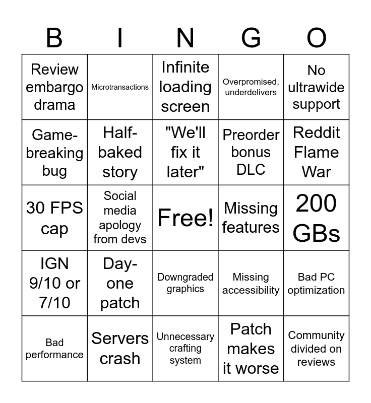 This bingo card has a free space and 24 words: Day-one patch, Servers crash, "We'll fix it later", Bad performance, No ultrawide support, Review embargo drama, Game-breaking bug, Microtransactions, Missing features, Downgraded graphics, Preorder bonus DLC, 30 FPS cap, Missing accessibility, Bad PC optimization, Half-baked story, Patch makes it worse, 200 GBs, Infinite loading screen, Reddit Flame War, Social media apology from devs, Community divided on reviews, IGN 9/10 or 7/10, Overpromised, underdelivers and Unnecessary crafting system.