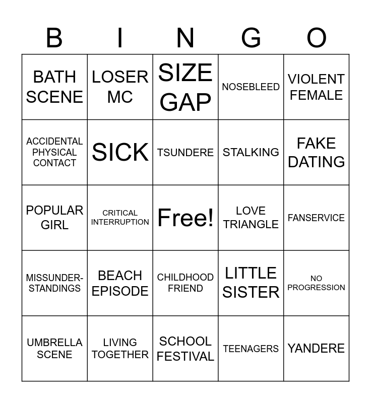 This bingo card has a free space and 24 words: BEACH EPISODE, LIVING TOGETHER, TSUNDERE, UMBRELLA SCENE, VIOLENT FEMALE, BATH SCENE, ACCIDENTAL PHYSICAL CONTACT, LOSER MC, LOVE TRIANGLE, CHILDHOOD FRIEND, STALKING, POPULAR GIRL, LITTLE SISTER, NO PROGRESSION, SICK, TEENAGERS, FANSERVICE, SIZE GAP, FAKE DATING, CRITICAL INTERRUPTION, YANDERE, MISSUNDER-STANDINGS, NOSEBLEED and SCHOOL FESTIVAL.