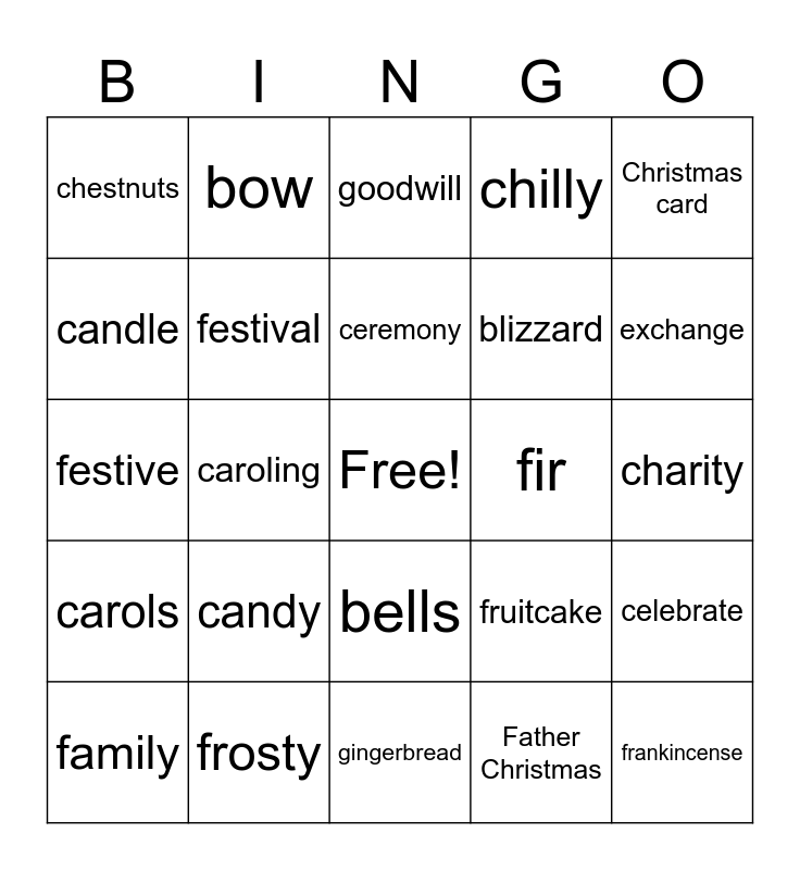 This bingo card has a free space and 63 words: angel, bough, candy cane, celebrate, chimney, artificial tree, bow, card, ceremony, Christmas, bells, box, charity, Christmas card, birth, candle, caroling, chestnuts, Christmas carol, blizzard, candy, carols, chilly, Christmas Eve, Christmas tree, cider, coal, cookie, decorations, display, eggnog, elf, eve, evergreen, exchange, family, family reunion, Father Christmas, feast, festival, festive, fir, fireplace, firewood, frankincense, frosty, Frosty the Snowman, fruitcake, garland, gift, gift-giving, gingerbread, gingerbread house, gingerbread woman, gold, goodwill, goose, Jesus, greetings, happy, holiday, holly and hope.