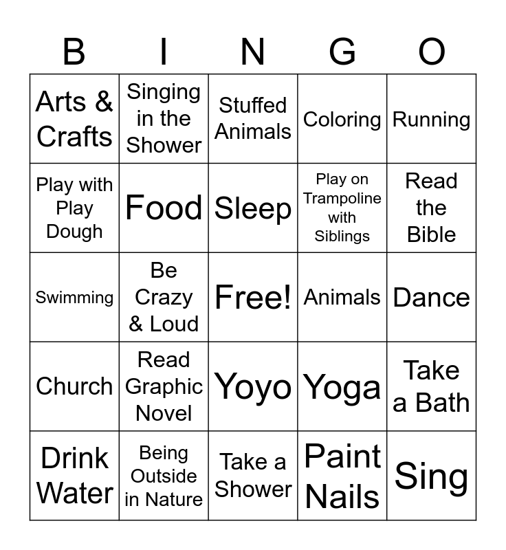 This bingo card has a free space and 29 words: Drink Water, Candy, Be Crazy & Loud, Fidget, Arts & Crafts, Stuffed Animals, Food, Read Graphic Novel, Animals, Being Outside in Nature, Dance, Sing, Take a Shower, Paint Nails, Read the Bible, School, Yoyo, Church, Running, Swimming, Yoga, Play Instrument, Play on Trampoline with Siblings, Play with Play Dough, Coloring, Singing in the Shower, Take a Bath, Sleep and Listen to Music.