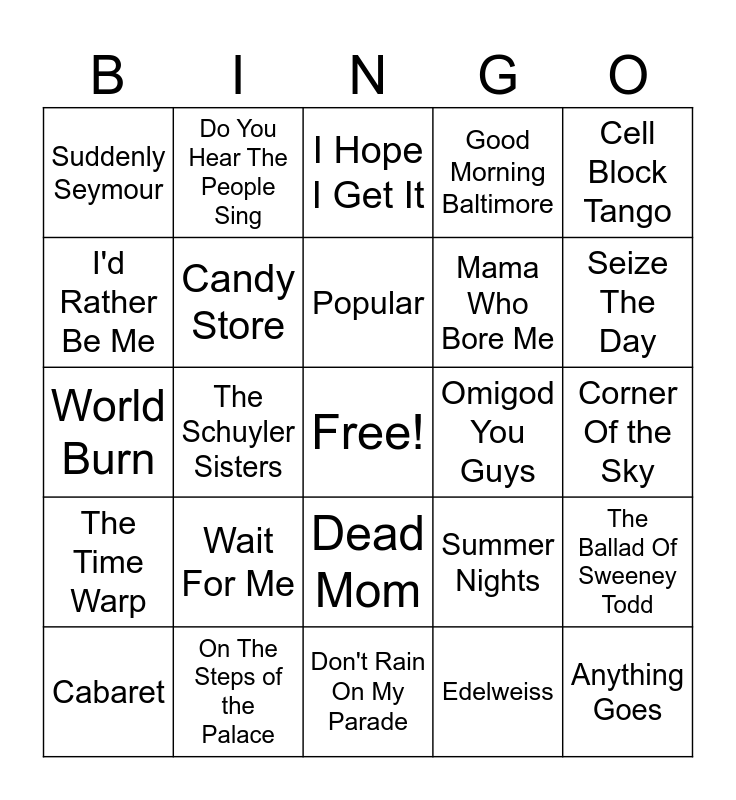 This bingo card has a free space and 36 words: Take Me or Leave Me, Lay All Your Love On Me, Ladies' Choice, Candy Store, Summer Nights, The Time Warp, Popular, Defying Gravity, Cell Block Tango, La Vie Boheme, The Schuyler Sisters, Good Morning Baltimore, I'd Rather Be Me, Omigod You Guys, Seize The Day, Suddenly Seymour, Cell Block Tango, Wait For Me, Anything Goes, I Hope I Get It, Corner Of the Sky, The Ballad Of Sweeney Todd, On The Steps of the Palace, Cabaret, Don't Rain On My Parade, Do You Hear The People Sing, World Burn, Masquerade, Mama Who Bore Me, I'd Rather Be Me, My Days, Dancing Through Life, Edelweiss, Dead Mom, Welcome to the Rock and Ya Got Trouble.