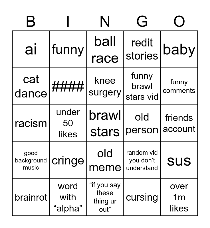 This bingo card has a free space and 24 words: cringe, word with “alpha”, knee surgery, brainrot, baby, ai, cat dance, funny, old person, old meme, funny brawl stars vid, racism, random vid you don’t understand, sus, ####, cursing, friends account, ball race, funny comments, under 50 likes, over 1m likes, good background music, redit stories and “if you say these thing ur out”.