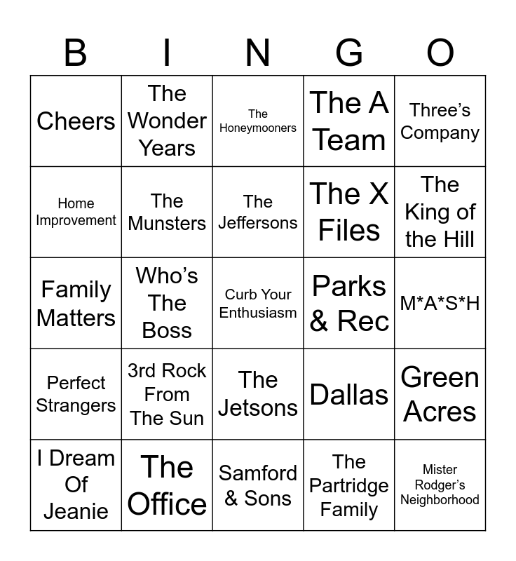 This bingo card has 30 words: The Office, All In The Family, Who’s The Boss, Dukes of Hazard, Cheers, The Honeymooners, The Munsters, The Jetsons, Parks & Rec, Samford & Sons, M*A*S*H, Curb Your Enthusiasm, The Partridge Family, Mister Rodger’s Neighborhood, The King of the Hill, Addams Family, Dallas, Perfect Strangers, 3rd Rock From The Sun, Three’s Company, Family Matters, Malcolm In The Middle, The Wonder Years, The X Files, Home Improvement, The A Team, Green Acres, I Dream Of Jeanie, The Jeffersons and The O.C..