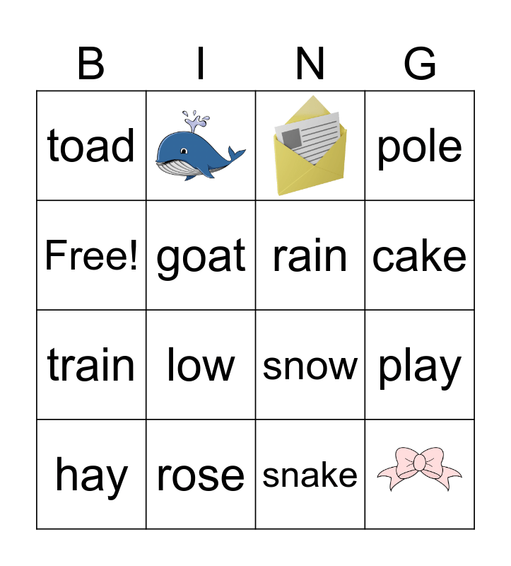 This bingo card has 3 images and 13 words: rose, play, toad, train, snow, snake, Free!, goat, hay, pole, low, cake and rain.