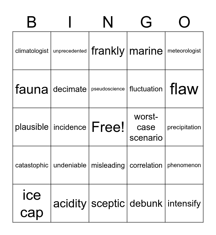 This bingo card has a free space and 25 words: undeniable, sceptic, pseudoscience, ice cap, meteorologist, climatologist, fauna, unprecedented, worst-case scenario, misleading, fluctuation, plausible, correlation, phenomenon, decimate, consensus, precipitation, frankly, flaw, incidence, intensify, acidity, catastophic, marine and debunk.