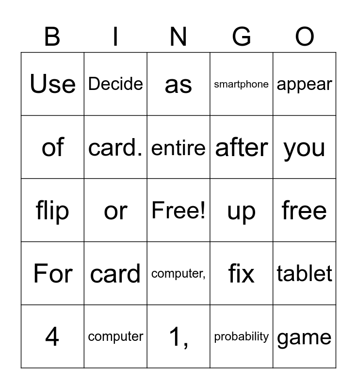 This bingo card has a free space and 92 words: like, which, 1,, 10, 10,000, 2, 3x3, 4, 4x4, 5x5,, a, across, Add, after, and, appear, as, automatically, bingo, bingo,, bingo,, Calculate, call, calls, card, card., cards, certain, Choose, column, computer, computer,, conduct, Customize, Decide, Drag, drop, enter, entire, fix, flip, For, free, from, game, generated, grids, if, images, in, list, list), liven, many, New!, not, number, of, on, or, over, page, per, Play, Print, probability, question/answer-style, question/clue, random, shuffle, single, size, smartphone, someone, space, square, tablet, the, them, to, traditional, up, Use, virtual, want, whether, will, winning, with, words/images, you and your.