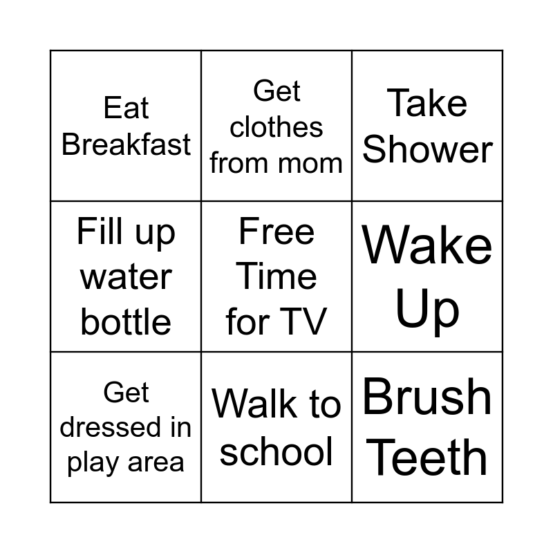 This bingo card has a free space and 8 words: Wake Up, Take Shower, Get clothes from mom, Get dressed in play area, Eat Breakfast, Brush Teeth, Fill up water bottle and Walk to school.