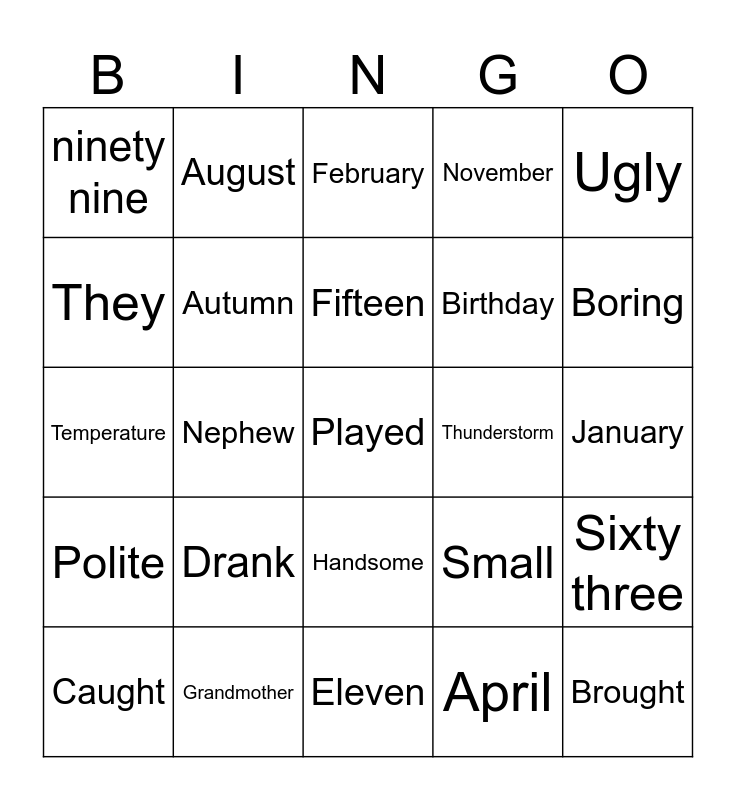 This bingo card has 70 words: Wednesday, January, Drink, Confident, Grandmother, Husband, November, Twenty eight, Ugly, Weird, Sixty three, Saturday, ninety nine, February, Thursday, Nephew, Handsome, Birthday, Cold, Polite, Thunderstorm, Small, Boring, Scorching, Weather, Freezing, Sunday, Tuesday, April, June, August, Partly cloudy, Sunny, Foggy, Favorite, Teenager, Excited, Friend, She, They, Brought, Drank, Played, Snowy, Spring, Autumn, Caught, Ran, Summer, Look, Walk, Smile, Wrote, Thirty five, Eleven, Twelve, Fifteen, Seventy eight, Forty four, Twenty two, Temperature, Cloudy, Tall, Short, Children, Niece, Uncle, Sister in law, Wife and Cousin.