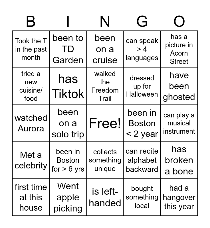 This bingo card has a free space and 25 words: been in Boston for > 6 yrs, is left-handed, walked the Freedom Trail, first time at this house, has a picture in Acorn Street, Took the T in the past month, tried a new cuisine/ food, been to TD Garden, been in Boston < 2 year, collects something unique, dressed up for Halloween, watched Aurora, can recite alphabet backward, has broken a bone, has Tiktok, is single, can play a musical instrument, been on a cruise, have been ghosted, been on a solo trip, had a hangover this year, Went apple picking, Met a celebrity, can speak > 4 languages and bought something local.