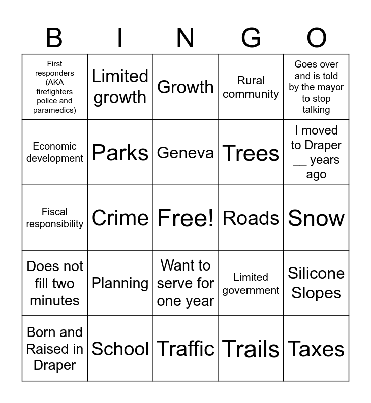 This bingo card has a free space and 29 words: Born and Raised in Draper, I just love Draper, Crime, Development, First responders (AKA firefighters police and paramedics), Growth, Parks, Planning, Roads, School, Snow, Taxes, Traffic, Trails, I moved to Draper __ years ago, Draper is our forever home, Want to serve for one year, Does not fill two minutes, Goes over and is told by the mayor to stop talking, Fiscal responsibility, Limited government, Top cities to live in, Trees, Economic development, Rural community, Limited growth, Silicone Slopes, Geneva and Paragliding.